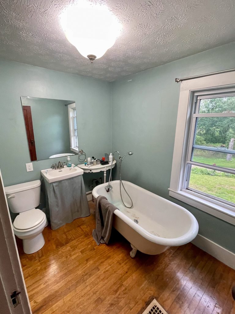 Originally the bathroom had been a boring unsightly box with only a tub (no shower), a toilet, a very dated pedestal sink, some crazy texture on the ceiling, and absolutely no storage. This was the only bathroom on the second floor and would function as the master bathroom.